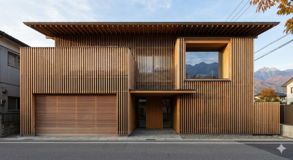• 外観: 道路面は窓を極力減らしたシンプルな塗り壁(グレーか白)+ガレージのシャッター周りにレッドシダー(木)を貼ってアクセントに。