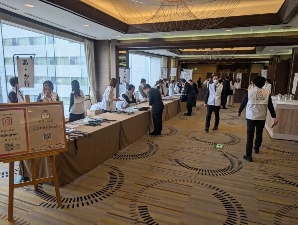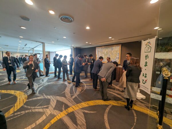 あらかじめの声掛けを徹底し、開始1時間前から続々お越しになる招待客の皆さん。6社社長の前には名刺交換の列が。